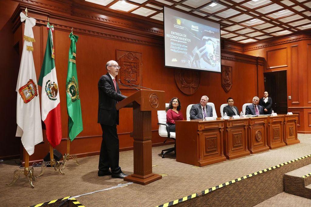 El rector, Carlos Eduardo Barrera Díaz apuntó que mediante un trabajo colaborativo entre la UAEMéx y la empresa multinacional Stellantis se diseñó un programa de maestría que forma profesionales altamente capacitados en el ecosistema de la electrificación automotriz.