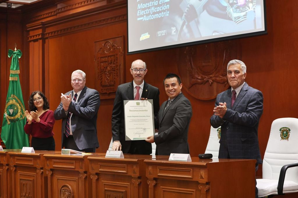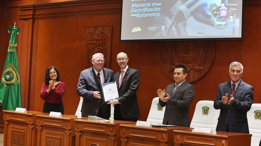 El panorama de la industria automotriz en México viene acompañado por tendencias geopolíticas que exploran mayores oportunidades de inversión en el país como principal centro de producción, por lo que ante este escenario, es importante la vinculación entre las universidades y las empresas para trabajar y desarrollar beneficios que permitan la cooperación entre instituciones, destacó el rector de la Universidad Autónoma del Estado de México (UAEMéx), Carlos Eduardo Barrera Díaz, al encabezar la ceremonia de entrega de diplomas a la primera generación de la Maestría en Electrificación Automotriz, en el Edificio de Rectoría.