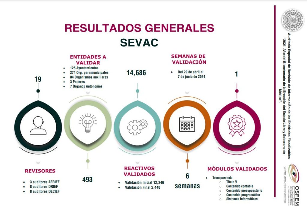 Así lo reflejaron los resultados generales del primer trimestre de 2024 del SEvAC, expuesto por el Órgano Superior de Fiscalización del Estado de México (OSFEM), los cuales se derivan de la validación de la información que 493 entidades municipales y estatales que aportaron a la Auditoría Especial de Revisión de Información de las Entidades Fiscalizables del OSFEM.